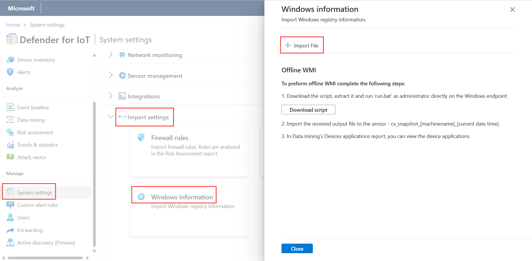 Sign into your OT sensor console, and select System Settings > Import Settings > Windows Information.
