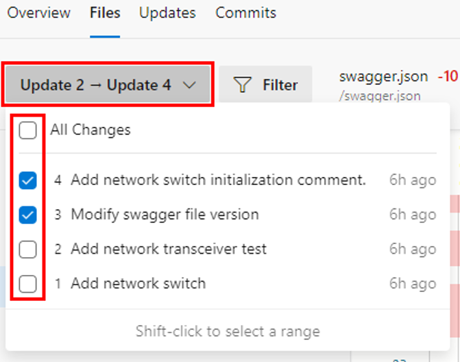 To review the changeset introduced by specific pushes to the source branch, select one or more changesets from the changes dropdown list. When you select one or more changesets, the diff view updates to show only the changes from the selected changesets. This feature is useful when changes have been pushed to the PR since your last review and you just want to see the new changes. The changes dropdown list names each changeset with the commit message from the final commit in each push operation.