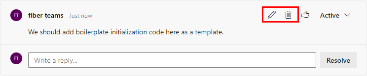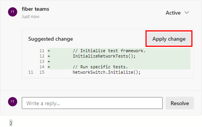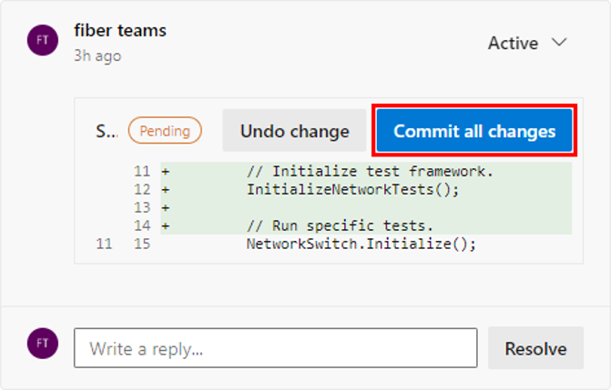 If you select Reply & resolve, the comment status will change to Resolved. PR authors can also directly change a comment's status, as described in the next section.