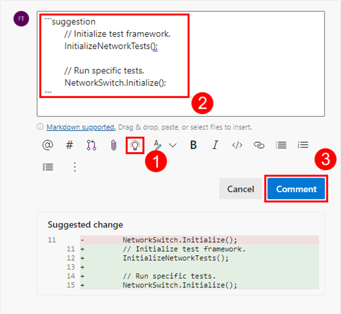 to open an inline comment box. You can also select multiple lines and then select the comment button that appears when you hover over those lines. If accepted, your suggested content will replace the line or lines that your comment was added to.Select the light bulb icon under the comment box to make your suggested changes in the comment box within a fenced code block, and then choose Comment. You won't see a light bulb icon if you add a comment to the original code (left-hand side) of a side-by-side diff view.