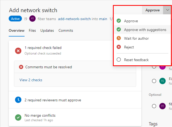 Reject: indicates that the changes aren't acceptable. When you choose this option, add a comment explaining why. If a required reviewer sets this vote option, the vote will block PR approval.
