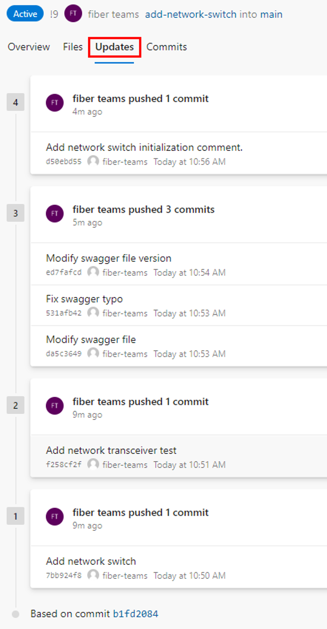 Choose the Commits tab to view the commit history of the source branch after it diverged from the target branch. The commit history in the Commits tab will be overwritten if the PR author force-pushes a different commit history, so the commits shown in the Commits tab might differ from the commits shown in the Updates tab.
