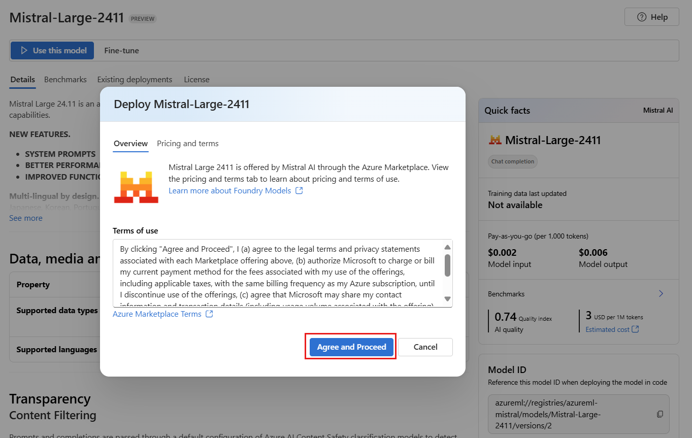 For model providers that require more contract terms, you're asked to accept those terms by selecting Agree and proceed.