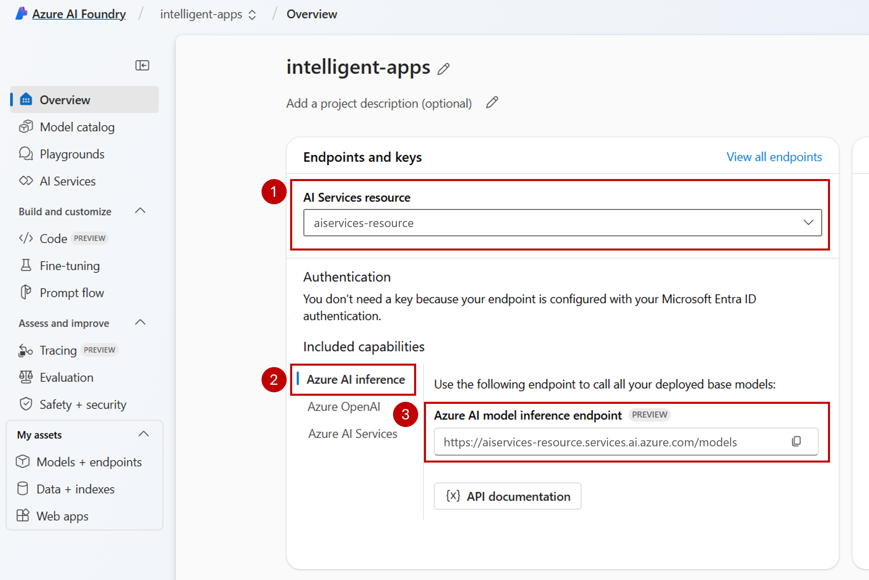 Once your Foundry resource is configured, you can start consuming it from your code. You need the endpoint URL and key for it, which can be found in the Overview section: