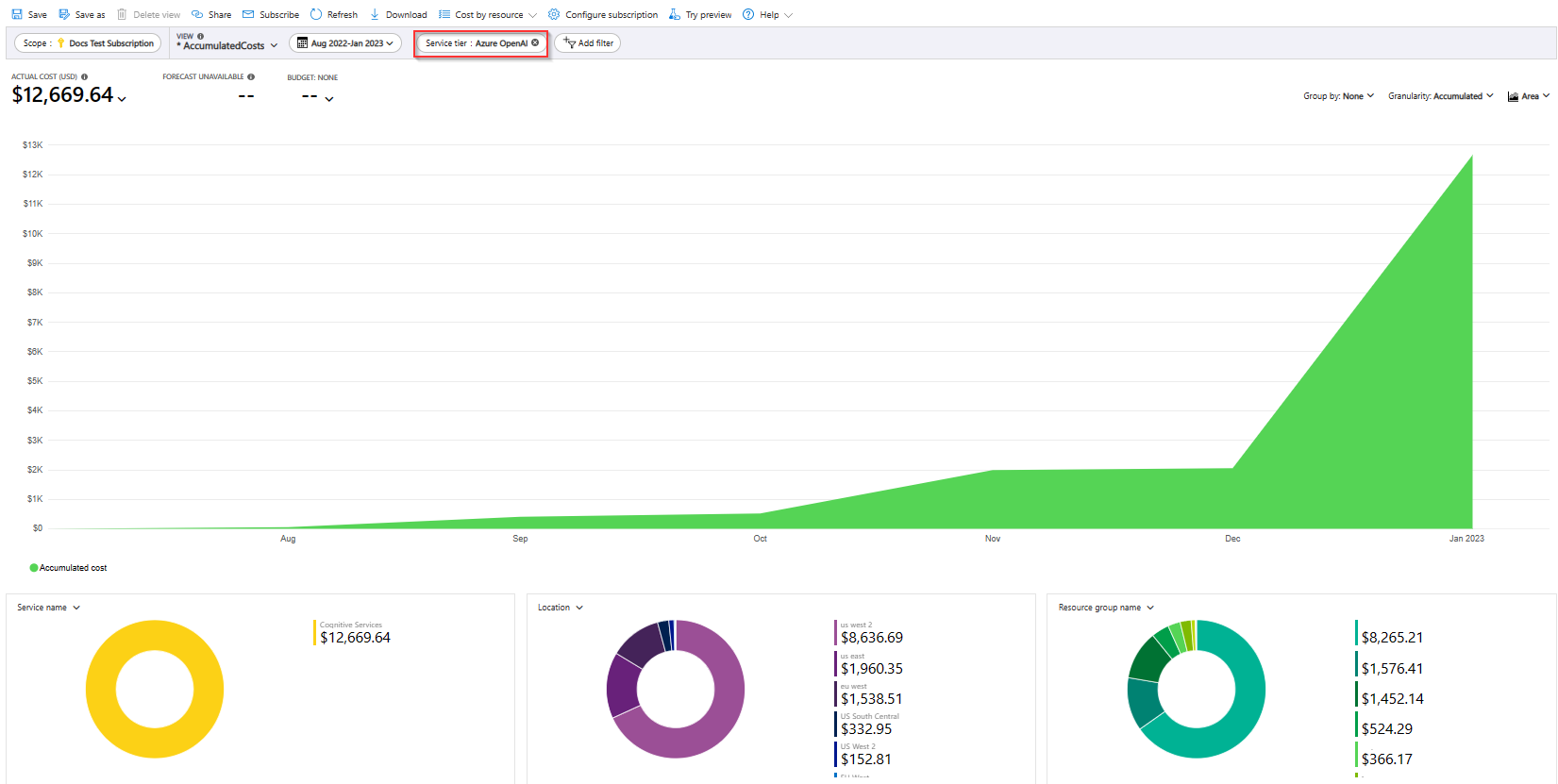 If you try to add a filter by service, you can't find Azure OpenAI in the list. This situation occurs because Azure OpenAI usage appears under the broader Cognitive Services service classification in Cost Management. If you want to focus on Azure OpenAI usage across a subscription, use Service tier: Azure OpenAI: