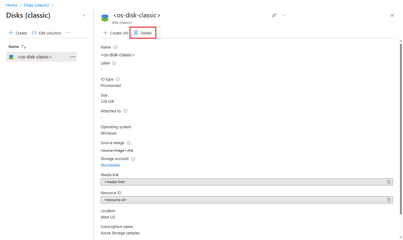 For more information about errors that may occur when deleting disk artifacts and how to address them, see Troubleshoot errors when you delete Azure classic storage accounts, containers, or VHDs.