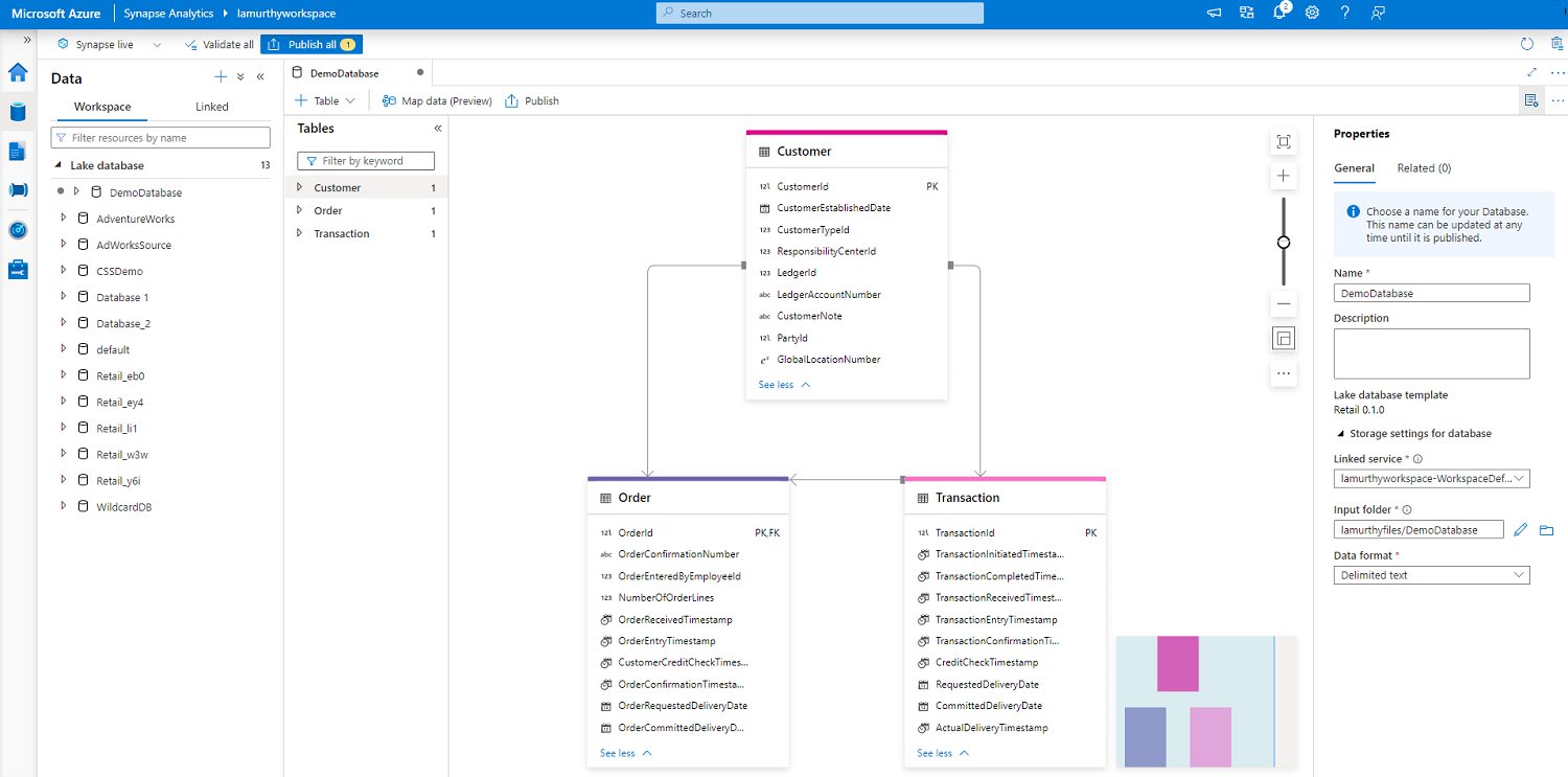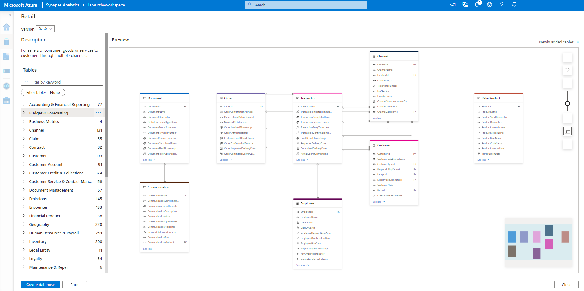 Once the canvas has all the tables that meet your requirements, select Create database to continue with creation of lake database. The new database will show up in the database designer and you can customize it per your business needs.