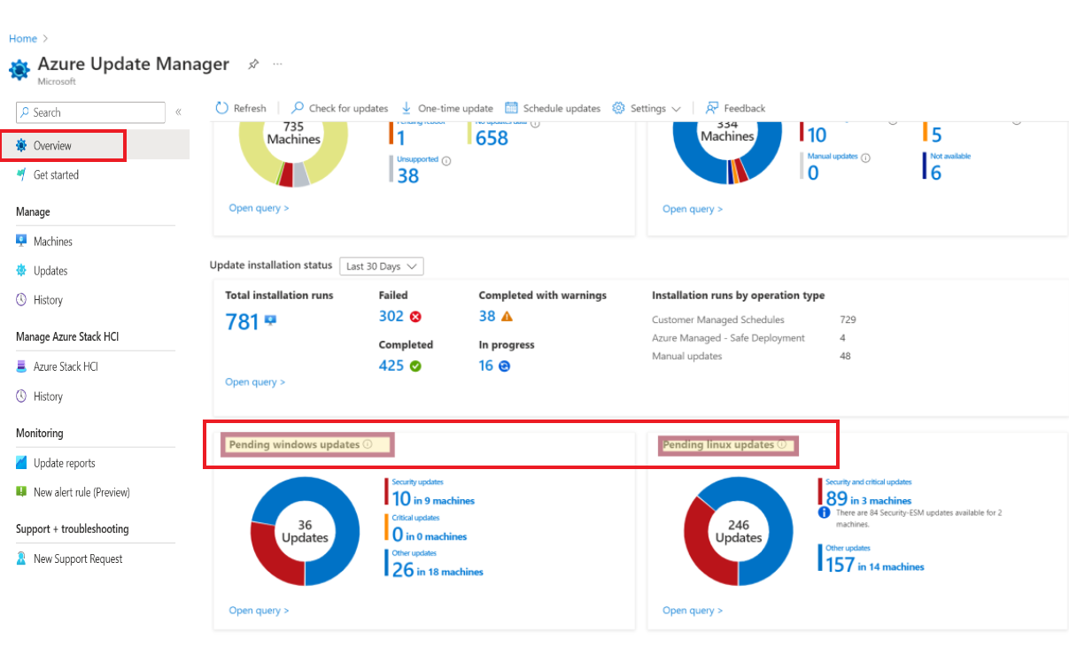 The Updates blade allows you to manage machines from an updates viewpoint. It implies that you can see how many Linux and Windows updates are pending and the update applies to which machines. It also enables you to act on each of the pending updates. To view the latest pending updates on each of the machines, we recommend that you enable periodic assessment on all your machines. For more information, see enable periodic assessment at scale using Policy or enable using update settings.