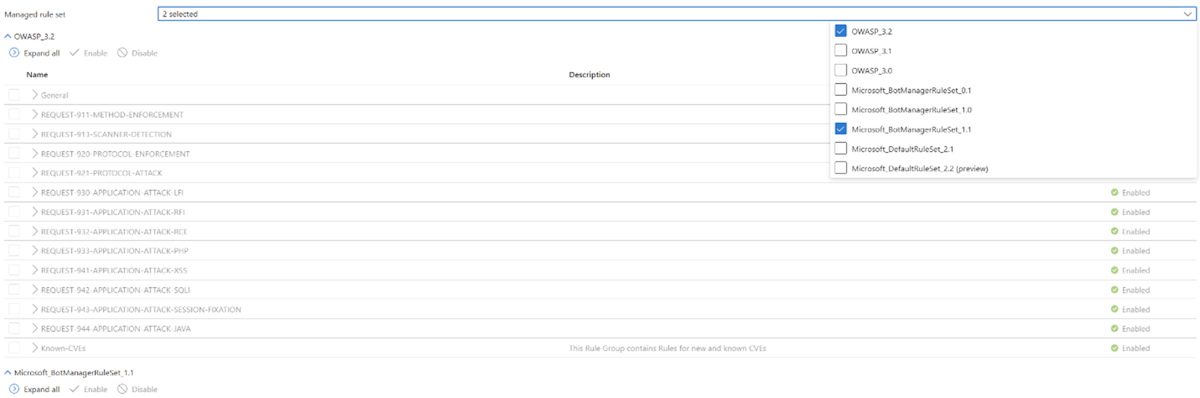 You can use the Bot Protection ruleset alongside any of the OWASP rulesets with the Application Gateway WAF v2 SKU. Only one OWASP ruleset can be used at any given time. The bot protection ruleset contains another rule that appears in its own ruleset. It's titled Microsoft_BotManagerRuleSet_1.1, and you can enable or disable it like the other OWASP rules.