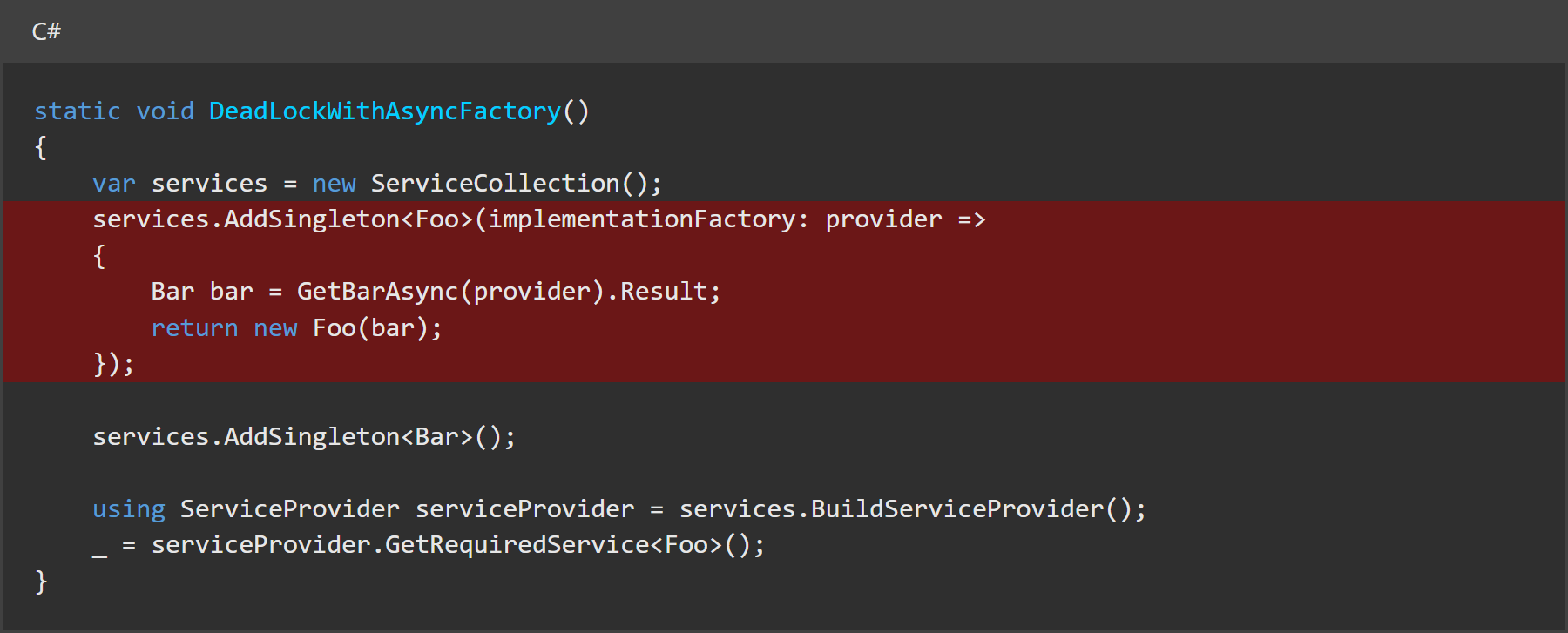 In the preceding code, the implementationFactory is given a lambda expression where the body calls Task<TResult>.Result on a Task<Bar> returning method. This causes a deadlock. The GetBarAsync method simply emulates an asynchronous work operation with Task.Delay, and then calls GetRequiredService<T>(IServiceProvider).