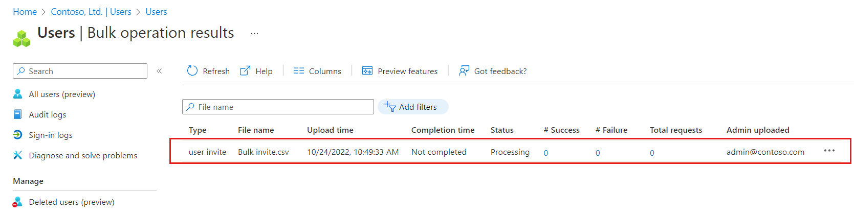 When your file passes validation, select Submit to start the Azure bulk operation that adds the invitations.