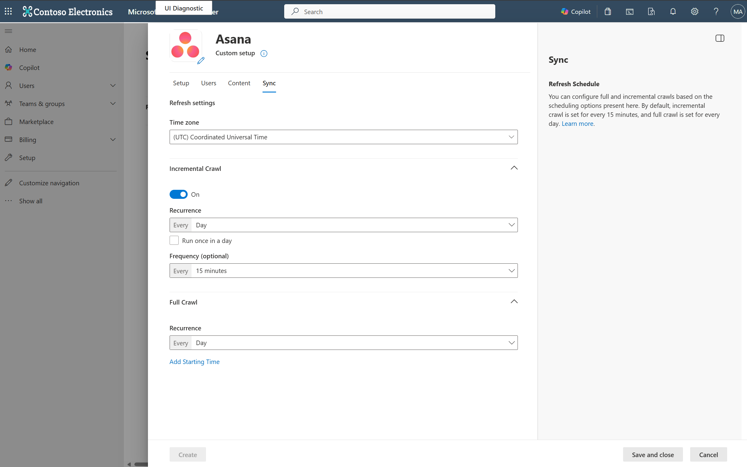 The refresh interval determines how often your data is synced between the data source and the Asana Copilot connector index. There are two types of refresh intervals - full crawl and incremental crawl. For more information, see refresh settings.