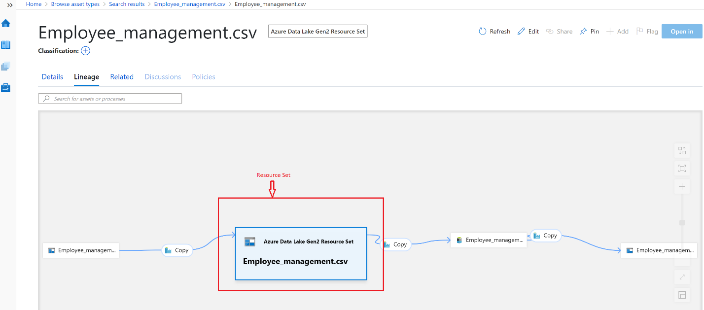 A resource set is a logical object in the catalog that represents many partition files in the underlying storage. For more information, see Understanding Resource sets. When Microsoft Purview captures lineage from Azure Data Factory, it applies the rules to normalize the individual partition files and create a single logical object.