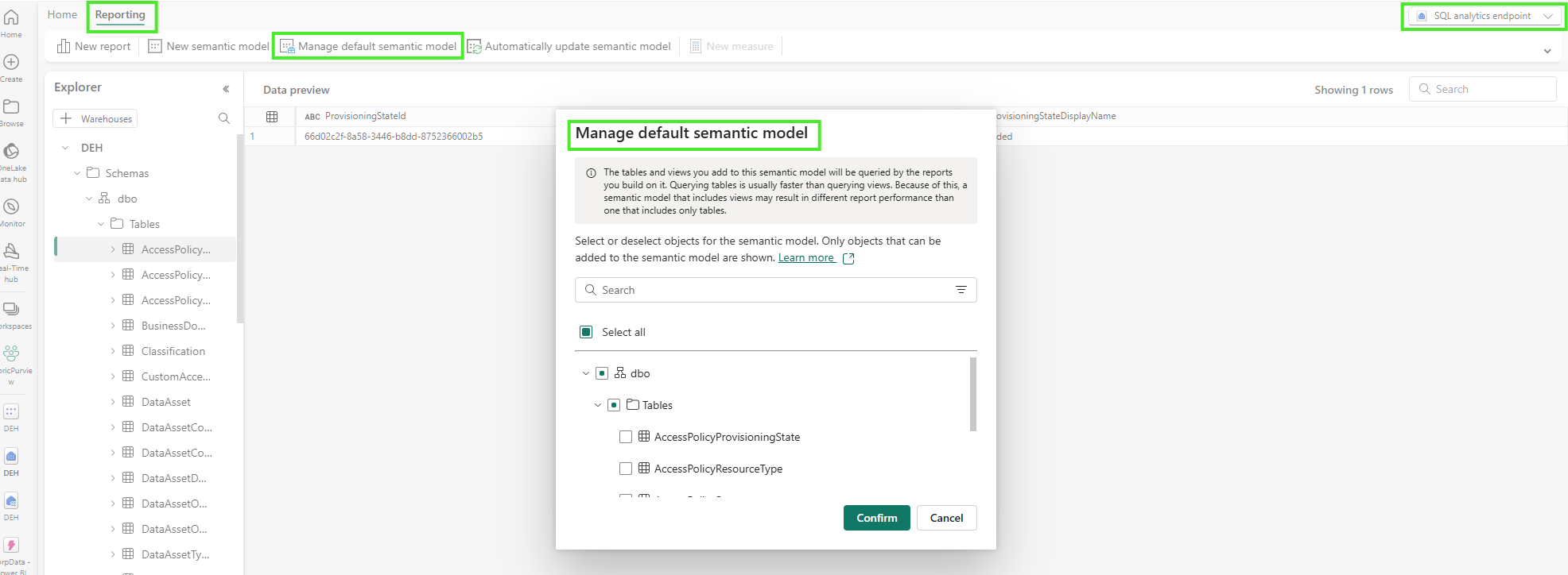 - Select the tables from dbo > Tables that you want to add to the semantic model for reporting.