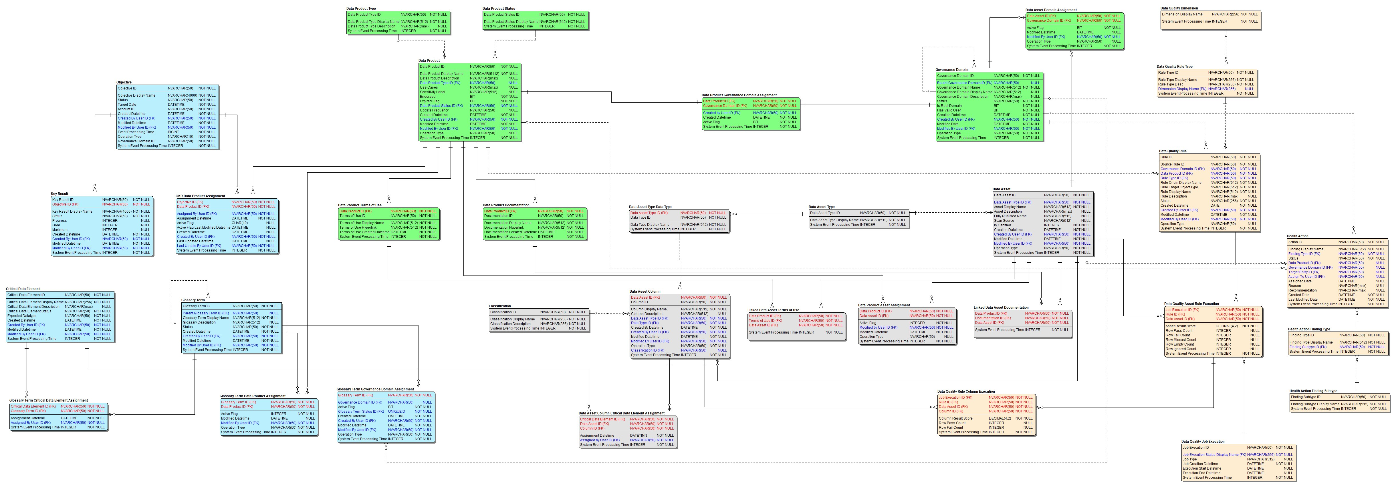 | Data Product Business Domain Assignment | Data product and governance domain assignment information | DataProductId (FK), BusinessDomainId (FK), AssignedByUserId (FK) |