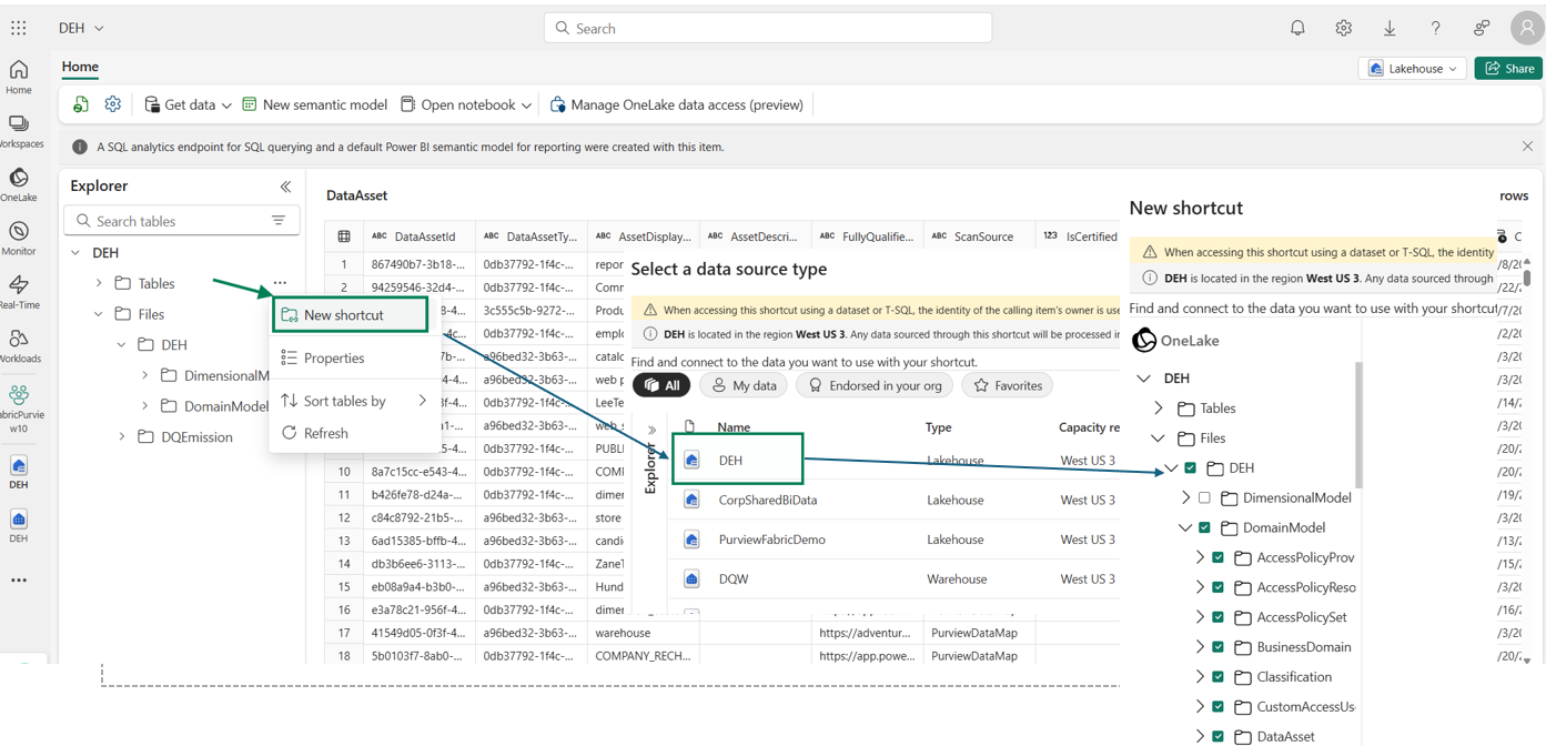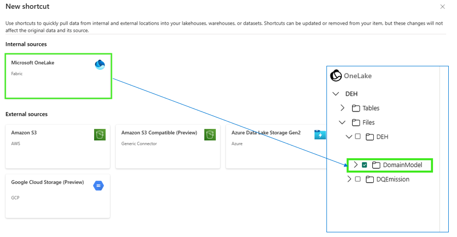 Use shortcut to create a shortcut of the domain model from OneLake and within OneLake.