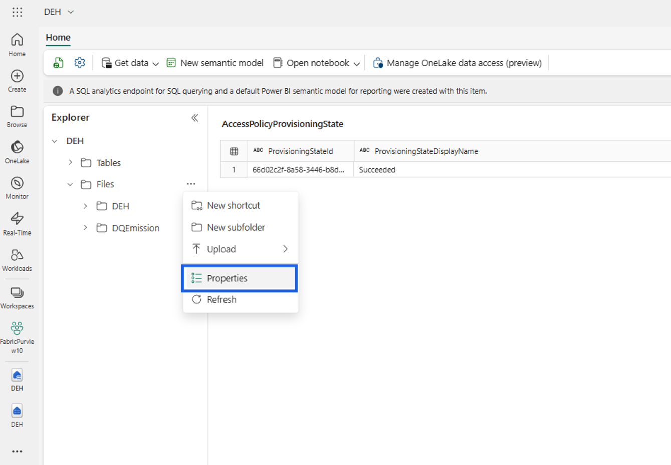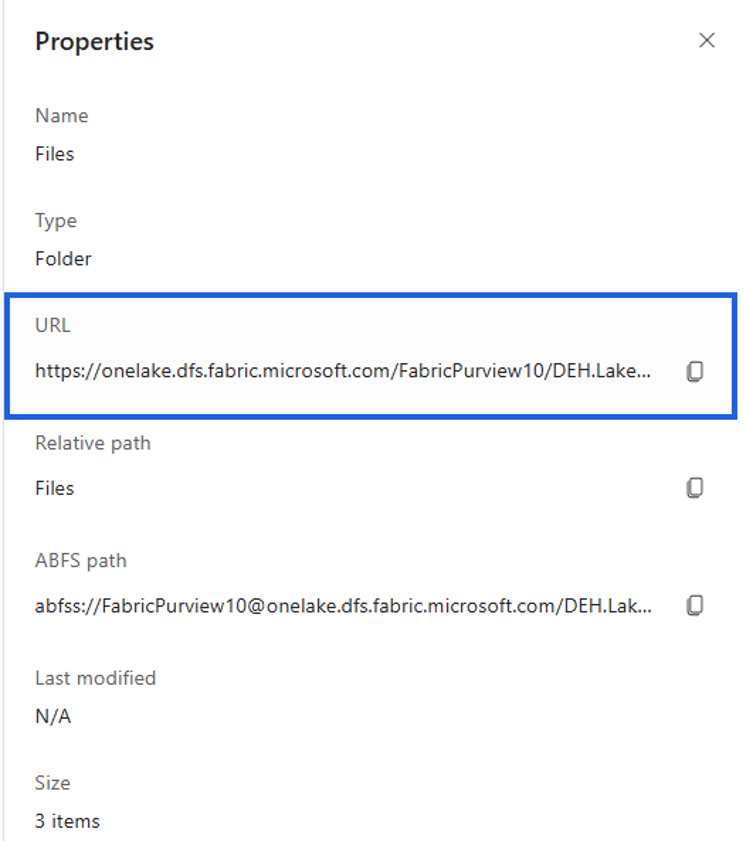 https://onelake.dfs.fabric.microsoft.com/workspace name/lakehouse name/Files/purviewmetadata)Select Properties to copy URL.