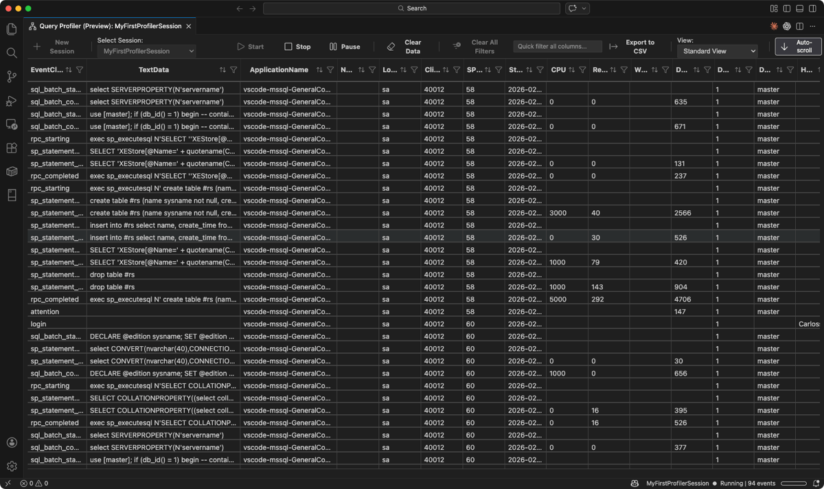 The Query Profiler in the MSSQL extension for Visual Studio Code captures and monitors database activity in real time using Extended Events. You can observe live T-SQL activity, identify slow operations, and find performance bottlenecks during development.