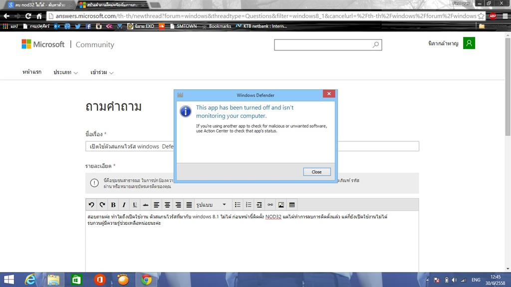 กลับมายังคำถามของคุณ ที่ได้เเจ้งมามายังทีมงานของเรา "เกี่ยวกับปัญหาการใช้งาน โปรแกรมเเอนตี้ไวรัส รุ่น Windows Defender ที่ได้ถูกติดตั้งมาพร้อม Windows 8.1 ตามมาตรฐาน เเต่ไม่สามารถเปิดใช้งานได้ ณ ตอนนี้ นั้น" เนื่องจากข้อมูลที่คุณได้เเจ้งมา ยังมีบางส่วนที่ไม่เพียงพอ ทางทีมงานของเราต้องขออนุญาต เพื่อสอบถามข้อมูลเพิ่มเติม ดังต่อไปนี้ นะครับ นะครับ;