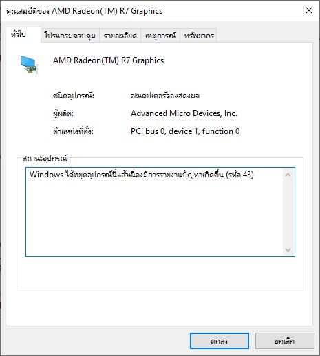 รหัสข้อผิดพลาด 43 หมายความว่า Driver ที่คุณใช้เป็น Driver ที่ไม่ใช่เวอร์ชั่นล่าสุดค่ะ ซึ่งมีความเป็นไปได้ว่า Driver ของ AMD ยังไม่มีการอัพเดทให้สามารถใช้ได้กับ Windows 10 เวอร์ชั่น 1903 ค่ะ อย่างไรก็ตาม เพื่อให้เราสามารถตรวจสอบให้ละเอียด ทางเรารบกวนคุณระบุเวอร์ชั่นเเละรุ่นของ Driver AMD ที่คุณใช้เเละยี่ห้อคอมพิวเตอร์ของคุณ เเล้วทางเราจะให้คำเเนะนำเพิ่มเติมนะคะ😉🤞