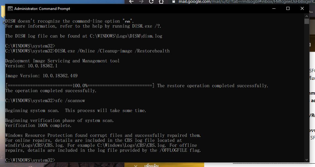 2019-11-06T03:15:44+00:00 ผลของการรัน SFC scan ได้พบไฟล์ของระบบที่เสียหายแต่สามารถแก้ไขไฟล์ดังกล่าวแล้ว ทางเราแนะนำให้ Restart เครื่องแล้วตรวจสอบว่าปัญหาดังกล่าวยังเป็นเหมือนเดิมหรือไม่