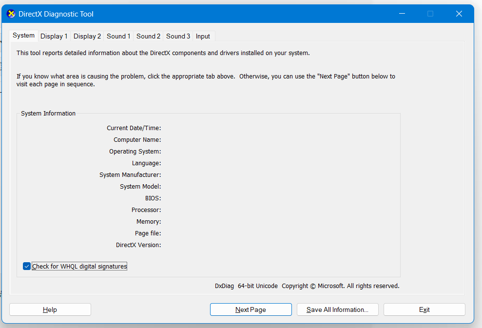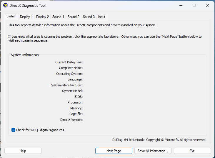 หน้าจอ directx information ไม่ขึ้นรายละเอียด