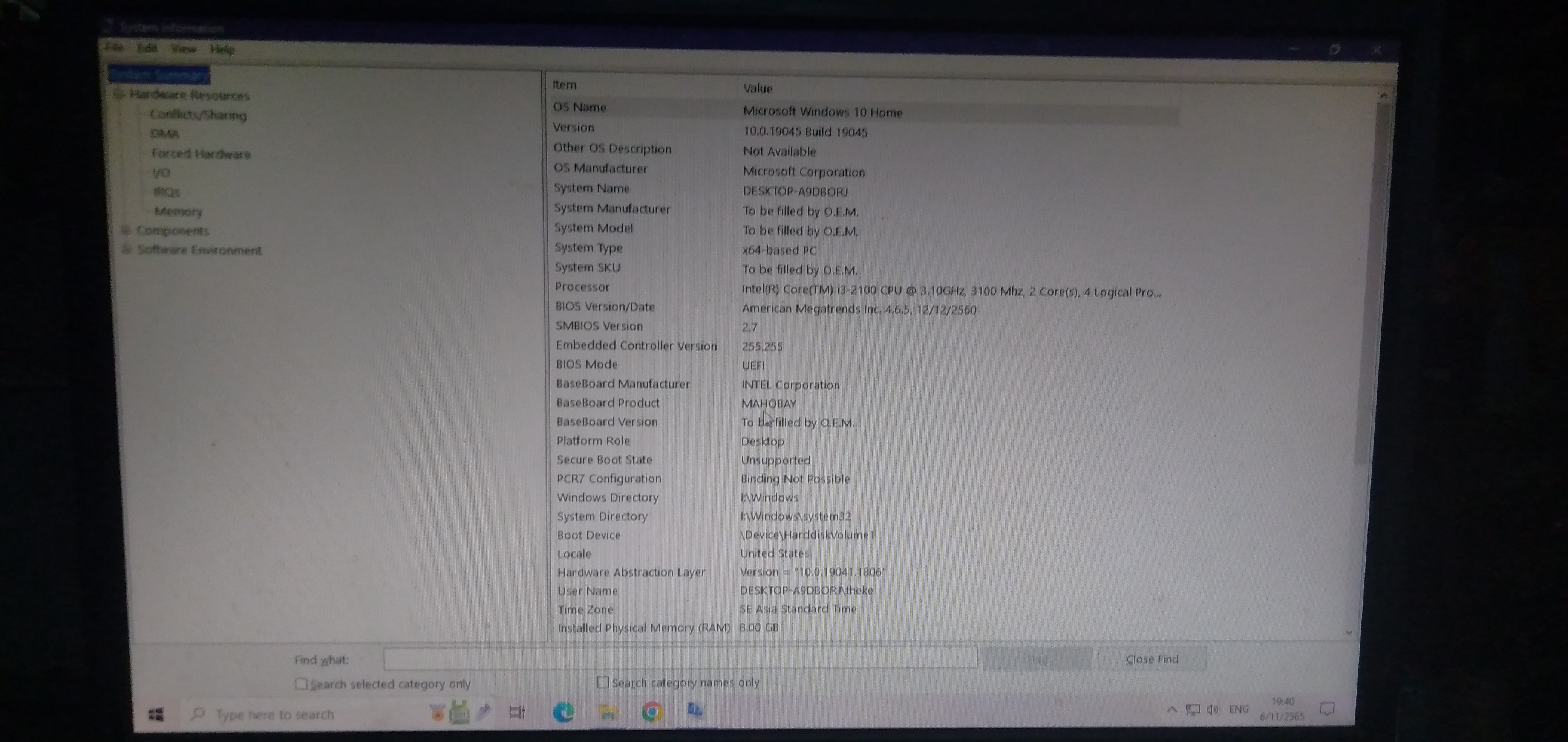 คลิกปุ่มเริ่มของคุณจากนั้นพิมพ์ msinfo แล้วกด Enter โปรดระบุภาพหน้าจอของหน้าต่างข้อมูลระบบที่เป็นผลลัพธ์