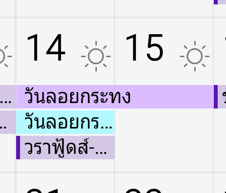 เวลาแสดงในปฎิทินที่โทรศัพท์ พบปัญหา วันหยุดจะเริ่มตั้งแต่ 07.00 ของวัน ไปจนถึง 07.00 ของวันถัดไป