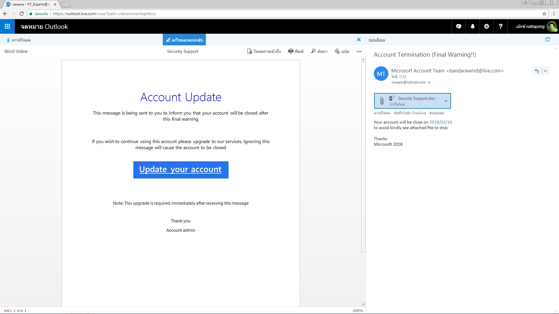 ทางทีมงานขอรบกวนให้คุณทำการส่งต่ออีเมลที่คุณได้รับมาที่บัญชีทดสอบของทางทีมงานด้วยค่ะ เพื่อที่ทางเราจะได้ทำการตรวจสอบอย่างละเอียดอีกครั้ง กรุณาส่งต่อต้นฉบับอีเมลที่คุณได้ทั้งหมด และห้ามเปลี่ยนแปลงหรือลบข้อความต่างๆในอีเมลค่ะ (คลิกที่ส่งต่อ แล้วกดส่ง) ส่งมาที่ ******@outlook.com กรุณาใส่หัวเรื่อง " สอบถามเรื่องมี email จาก admin hotmail ส่งมาให้ยืนยัน เป็น email จาก hotmail จริงๆไหมครับ เคส CAS-8009633-L0F0Q6”