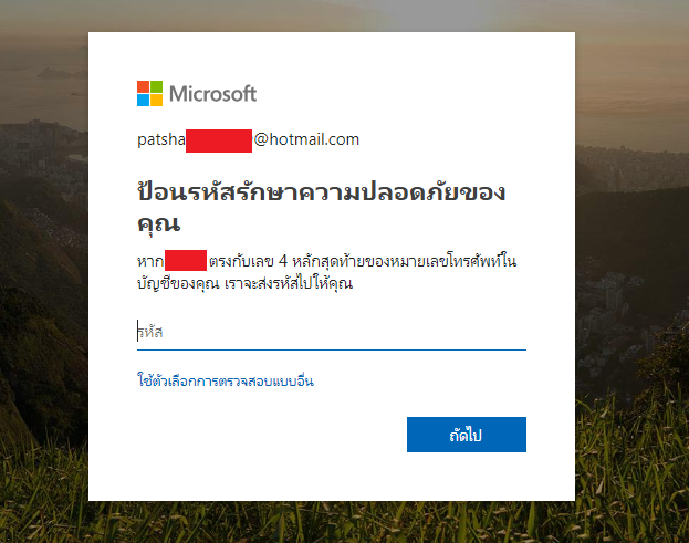 จากรูปกรอกหมายเลขโทรศัพท์ 4 ตัวท้ายไปเรียบร้อยแล้ว ตามปกติทางระบบ Outlook ต้องส่งรหัส 7 ตัวมาให้