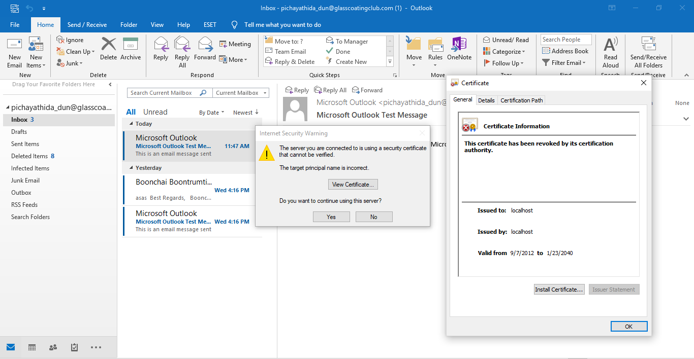สาเหตุของข้อผิดพลาดดังกล่าวเกิดจากมีข้อผิดพลาดเกี่ยวกับการตั้งค่าของ Outlook ของคุณ ซึ่งการตั้งค่าดังกล่าวทางเราไม่สามารถเเนะนำหรือระบุได้ว่าผิดพลาดตรงไหน เนื่องจากอีเมลของคุณใช้ Domain ของ @glasscoatingclub ซึ่งไม่ใช่ Domain จาก Microsoft ดังนั้น เพื่อให้คุณสามารถตรวจสอบเเละเเก้ปัญหาตรงจุด ทางเราเเนะนำให้ปรึกษาผู้ดูเเลระบบของ Domain ดังกล่าวโดยตรงนะคะ