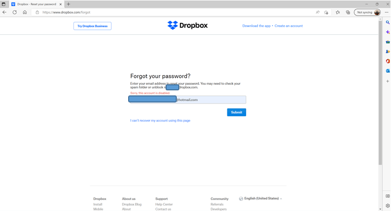 จากคําอธิบายที่คุณโพสต์ดูเหมือนว่าคุณมีปัญหากับ Outlook ซึ่งการใช้บัญชี Hotmail ของคุณถูกปิดใช้งานจากการใช้บริการจัดเก็บข้อมูลบนคลาวด์ที่เรียกว่า Dropbox