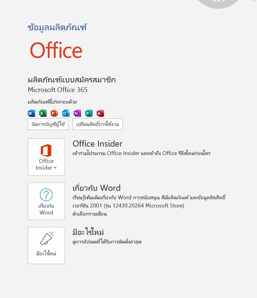 3. เพื่อความแน่ใจ ทางเรารบกวนคุณรายละเอียดเกี่ยวกับโปรแกรม Office โดยเปิดโปรเเกรม word > คลิก File จากนั้นคลิก Account > ให้ส่งภาพหน้าจอ Product Information มาให้ทางเราตรวจสอบหน่อยนะคะ