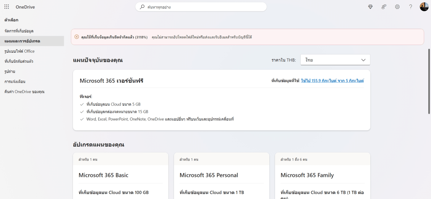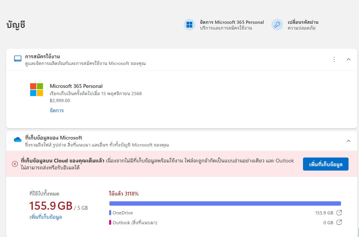 ตามคําอธิบายของคุณและภาพหน้าจอที่ให้ไว้ Microsoft 365 Personal Edition ควรมีพื้นที่เก็บข้อมูล 1TB แต่แสดงพื้นที่เพียง 5GB ไม่สามารถใช้ OneDrive และ Outlook เกิดจากข้อผิดพลาดในการแสดงพื้นที่เก็บข้อมูลสําหรับข้อมูลเพิ่มเติมคุณสามารถคลิกที่นี่เพื่ออ้างอิง: เมื่อบัญชี OneDrive ของคุณถูกระงับหมายความว่าอย่างไร - ฝ่ายสนับสนุนของ Microsoft