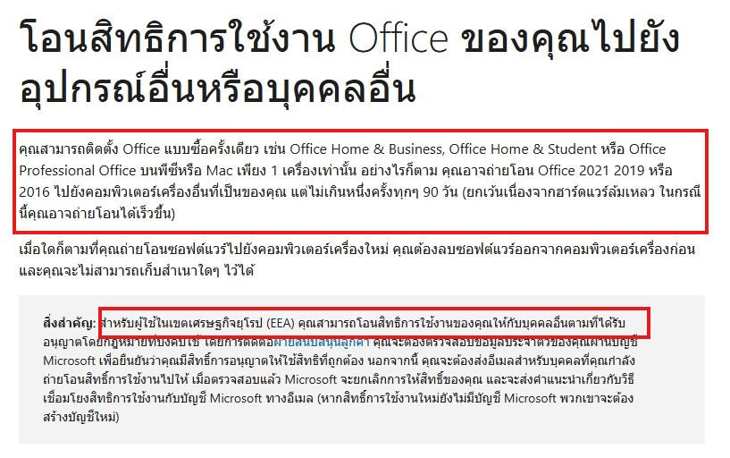 สําหรับข้อมูลเพิ่มเติม คุณสามารถดูบทความนี้: การถ่ายโอนสิทธิ์การใช้งาน Office ของคุณไปยังอุปกรณ์หรือบุคคลอื่น - ฝ่ายสนับสนุนของ Microsoft