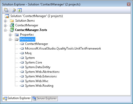 - Add a reference to the Moq assembly by right-clicking the References folder in the ContactManager.Tests project and selecting Add Reference. Under the Browse tab, browse to the folder where you unzipped Moq and select the Moq.dll assembly. Click the OK button.