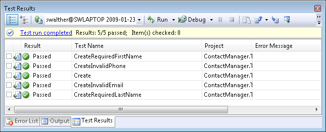 You can run the unit tests in Listing 1 by selecting the menu option Test, Run, All Tests in Solution (CTRL+R, A). The results of the tests are displayed in the Test Results window (see Figure 4).