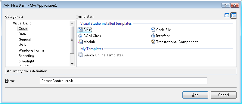- Name the new class PersonController.vb and click the Add button.