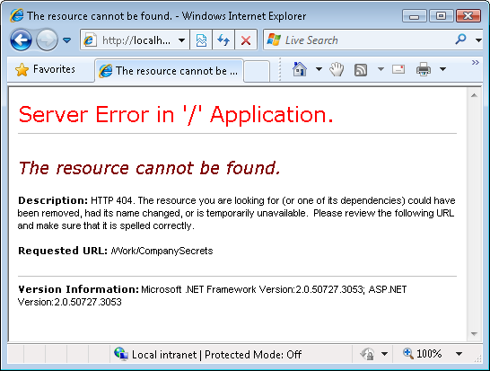 If you attempt to invoke the CompanySecrets() controller action by typing /Work/CompanySecrets into the address bar of your browser then you'll get the error message in Figure 1.