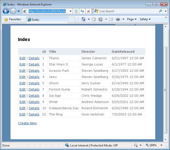 If you don't like anything about the appearance of the grid of database records in Figure 7 then you can simply modify the Index view. For example, you can change the DateReleased header to Date Released by modifying the Index view.