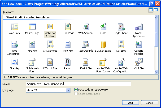 Figure 13: Add a New Web User Control to the UserControls Folder (Click to view full-size image)