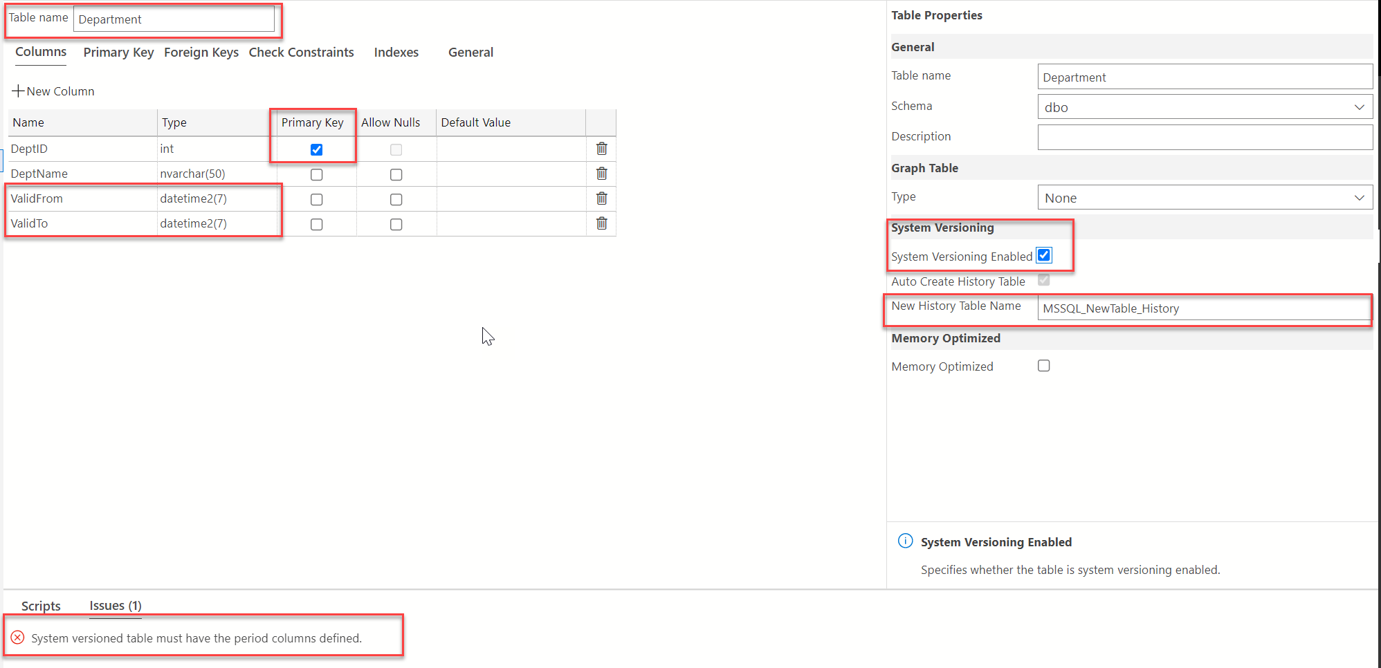 Create a table called "Department" with the column properties as seen below. To do this, right-click on the Tables folder in the Connections pane and select "New Table." Next, in the Table Properties pane, select the "System Versioning Enabled" check box. You can decide to rename this history table or leave the default name as is.