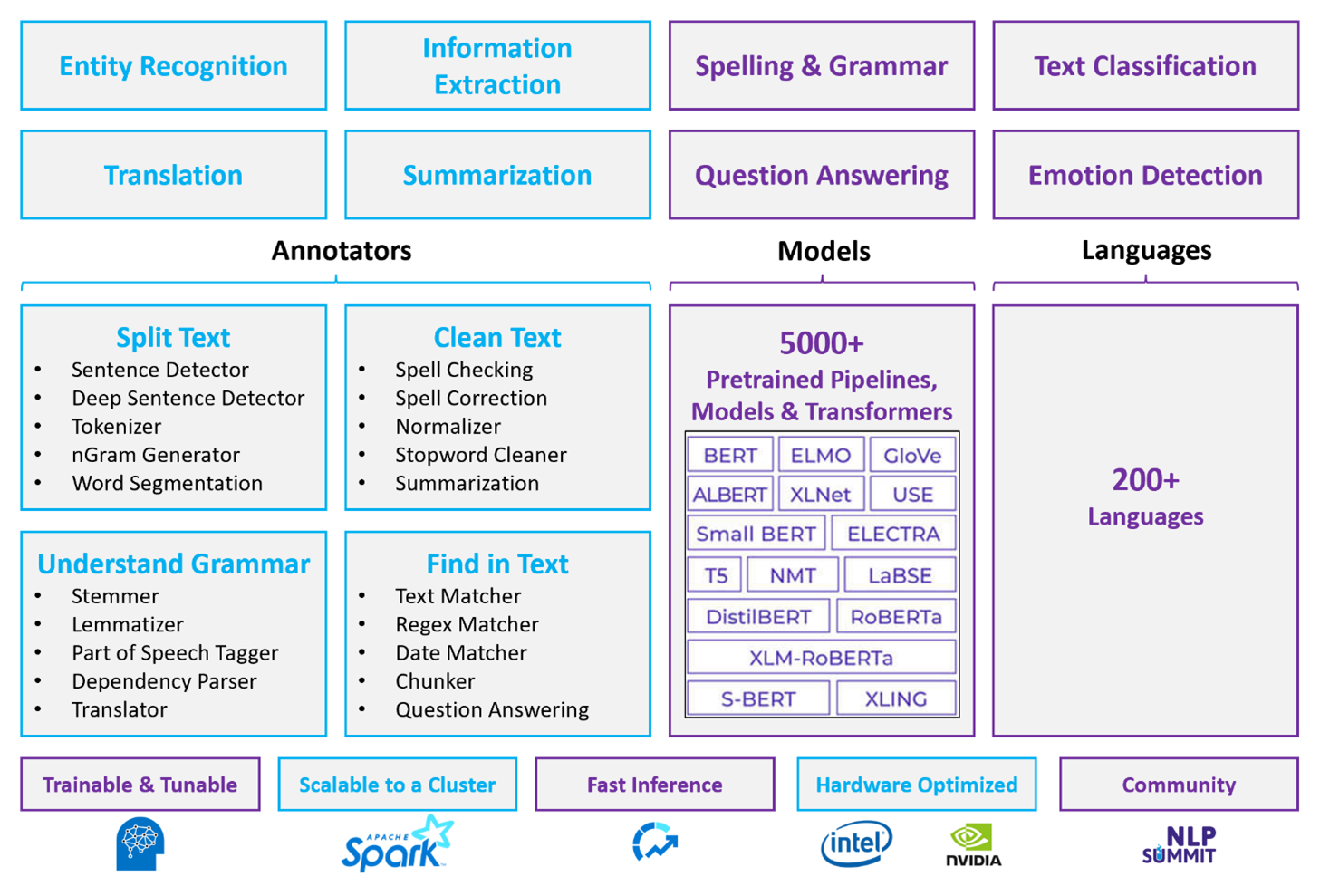Spark NLP is an open-source library with Python, Java, and Scala support. The library provides functionality comparable to spaCy and Natural Language Toolkit (NLTK), including spell check, sentiment analysis, and document classification.