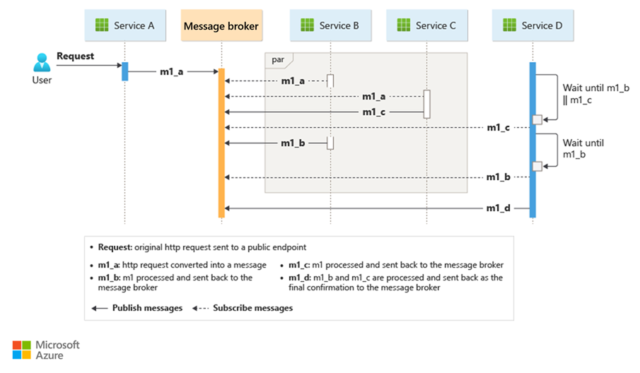 The services or the subscriber polls the broker to determine whether it can process that message based on its implemented business logic. The broker can also push messages to subscribers interested in that message.
