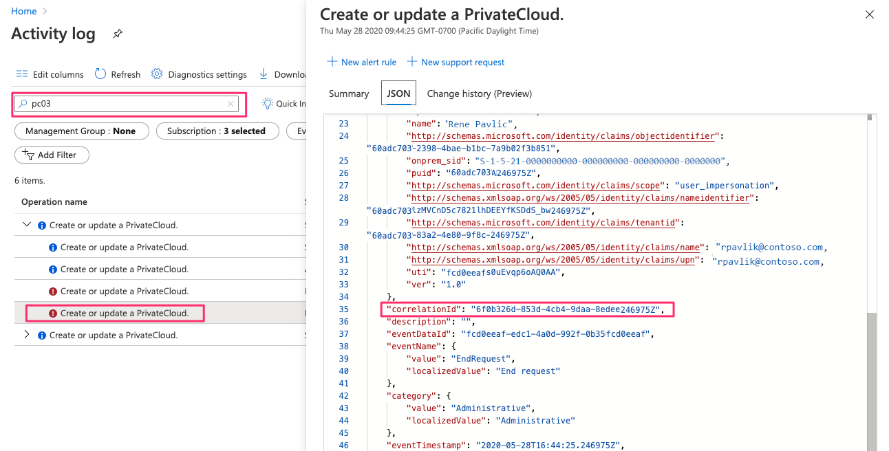 When you create a private cloud or any resource in Azure, a correlation ID for the resource is automatically generated for the resource. Include the private cloud correlation ID in your support request to more quickly open and resolve the request.