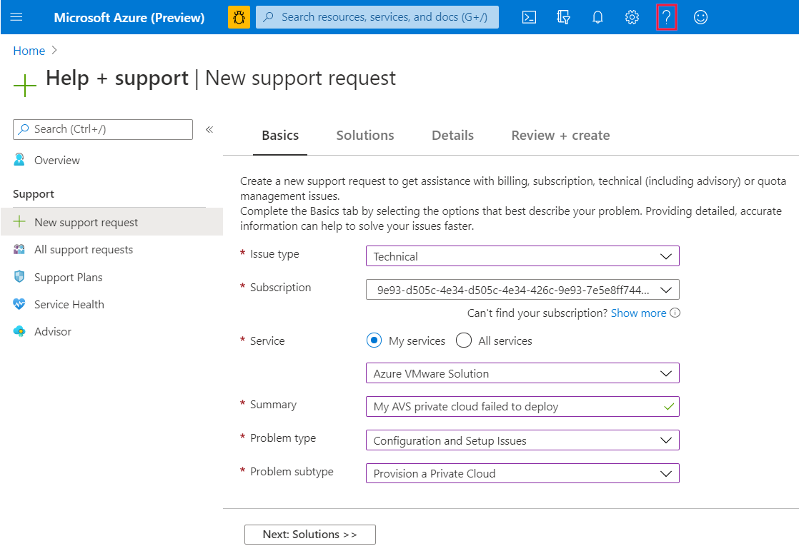 To create a support request for an Azure VMware Solution deployment or provisioning failure: