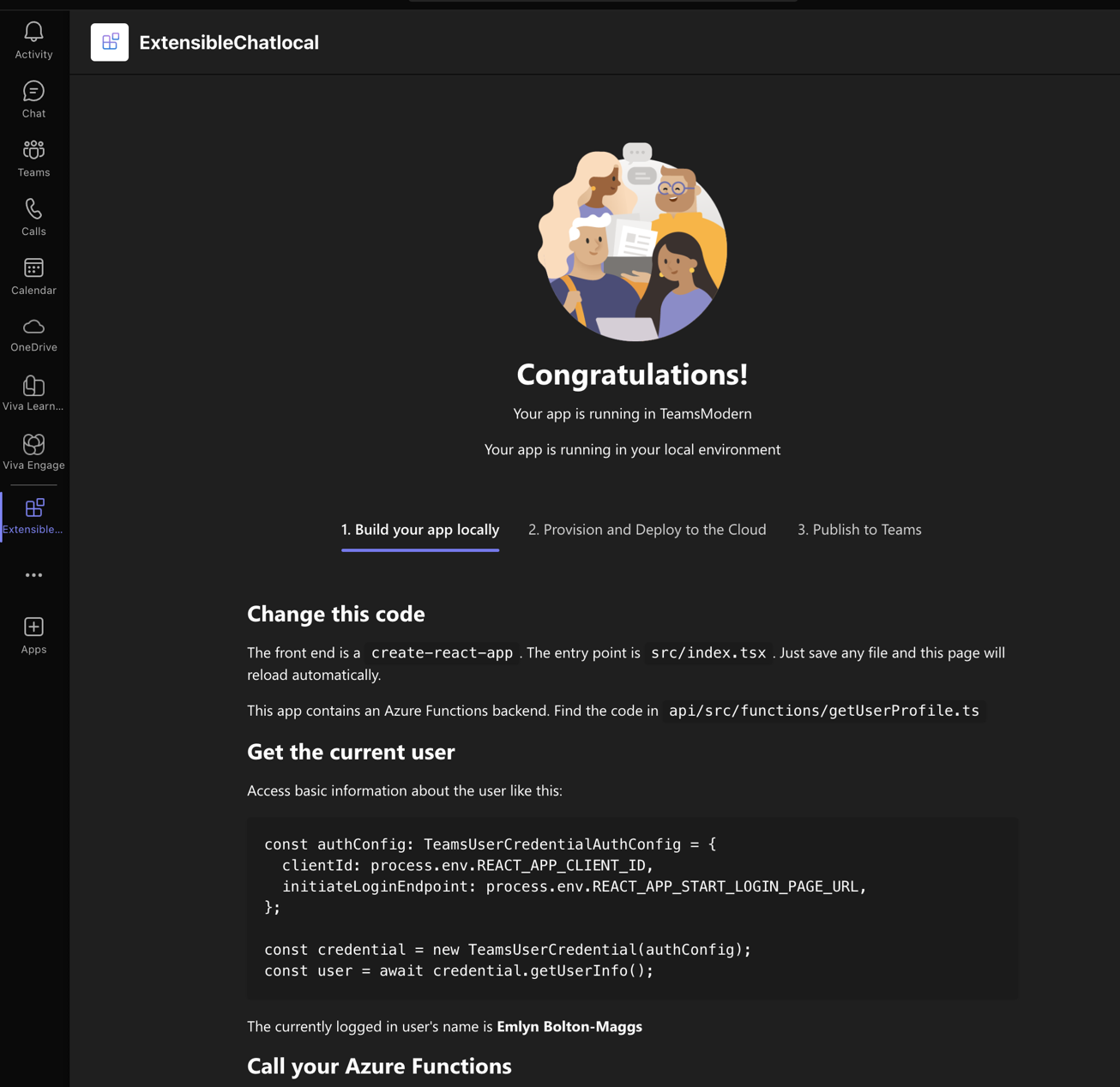 This project has a templated API implementation through Azure Functions. At this point, you need to create the complete backend implementation for a chat platform. The Basic Tab option provides the web app frontend structure. It also enables SSO for the app as described in Develop single sign on experience in Teams | GitHub.