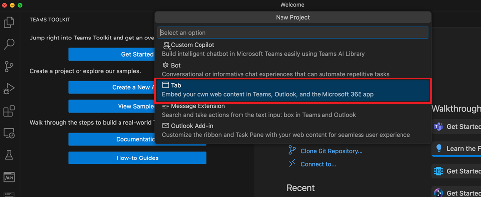 In the Microsoft Teams Toolkit, select New Project > Tab.