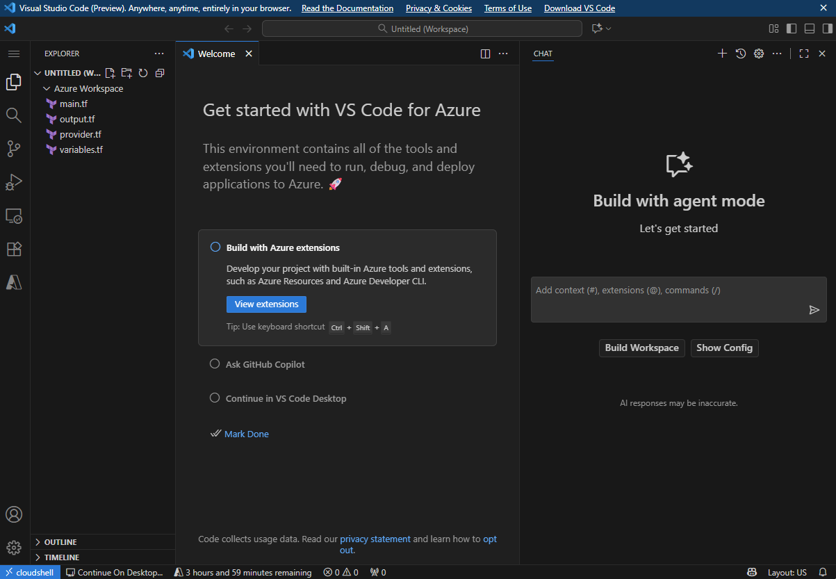 To use this feature, select Open in VS Code (Web) after reviewing your generated Terraform configurations in the artifact pane. This action launches a VS Code web workspace with the generated files opened for review and editing.