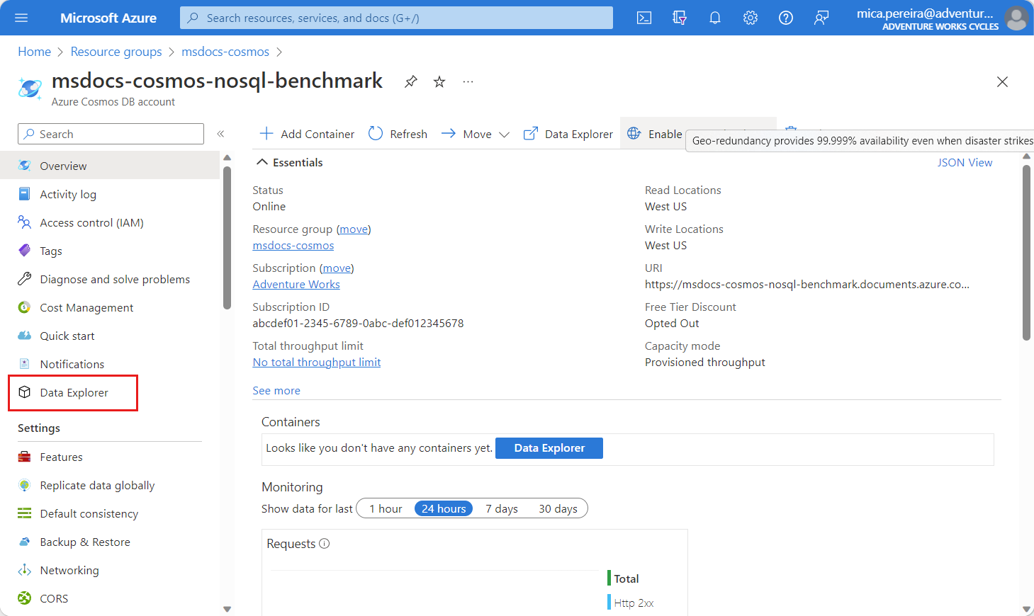 1. Navigate to your existing API for NoSQL account in the Azure portal.